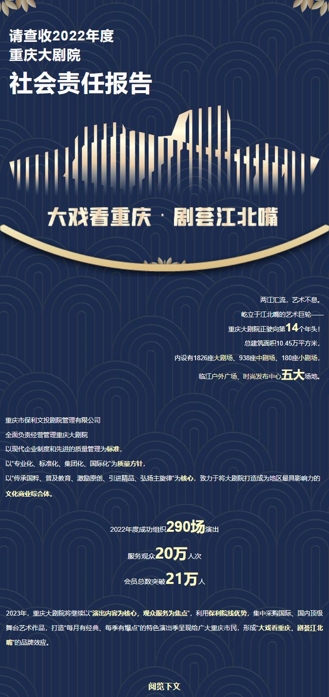 重庆大剧院是重庆市确定的十大社会文化事业基础设施之一,是社会各界公认的重庆城市文化名片。2022年在集团党委的坚强领导下,重庆大剧院运营团队推出“青苗工程”“古典会客厅”“江畔音乐会”“重返剧场计划”“保利云剧院”等创新经营模式,全年共举办283场演出,再创演出接待场次新高,同时坚持高水平策划“每月有经典,每季有爆点”,逐步形成了“大戏看重庆、剧荟江北嘴”的市场口碑,进一步活跃了重庆演出市场。