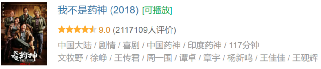 2017年的《战狼2》,吴京将军事动作片带到新高度,主打大国自信;2018年的《我不是药神》,徐峥化身“药神”,缓解白血病人看病难的问题;2019年的《哪吒之魔童降世》,饺子让全国人民都认识了烟熏妆哪吒,把传统故事开出新花。