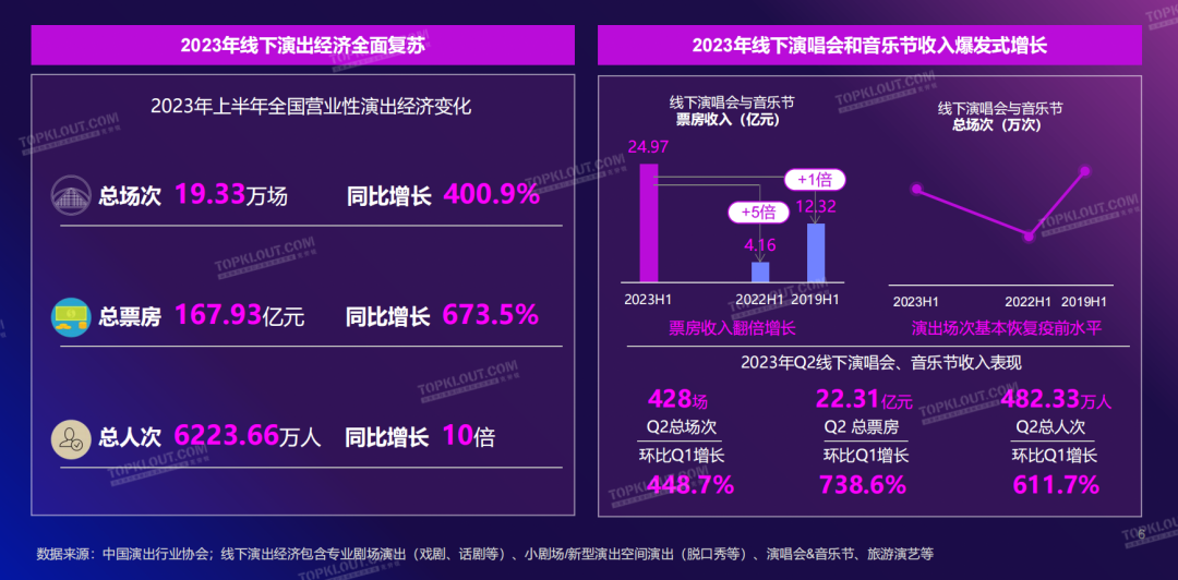 根据中国演出行业协会公布的数据显示,2023年上半年全国营业性演出总场次为19.33万场,总票房为167.93亿元,同比长673.5%。复苏与增长成为了线下演出市场的核心关键词。