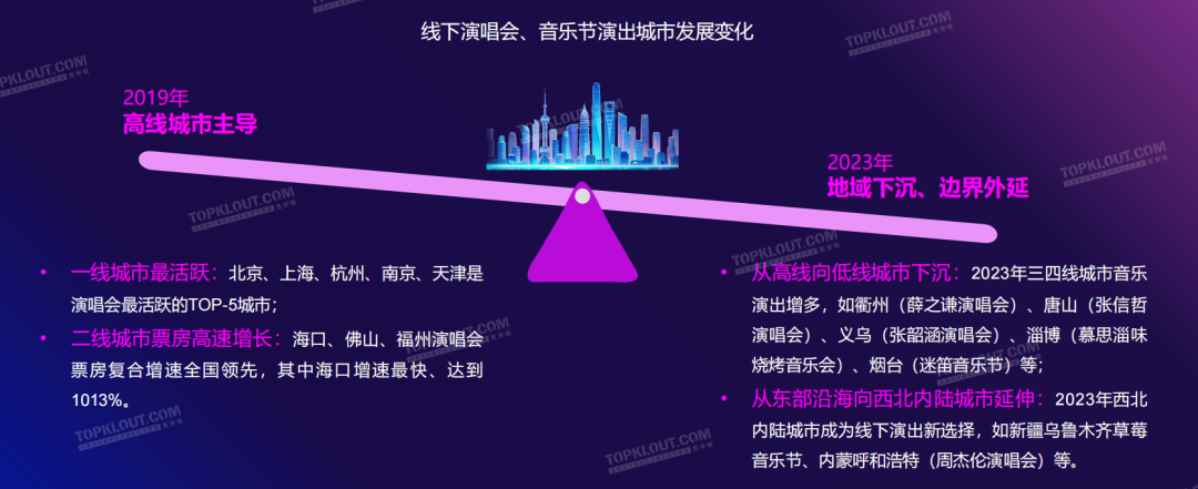 2023年演唱会市场一个突出性的特征是演出城市「地域下沉」。中国演出行业协会《2023上半年全国演出市场简报》指出,2023年三四线城市音乐演出增多,演出城市从一二线向三四线城市延伸;在地域分布上,以新疆乌鲁木齐音乐节为代表,西北内陆城市也开始成为线下音乐演出的新选择。