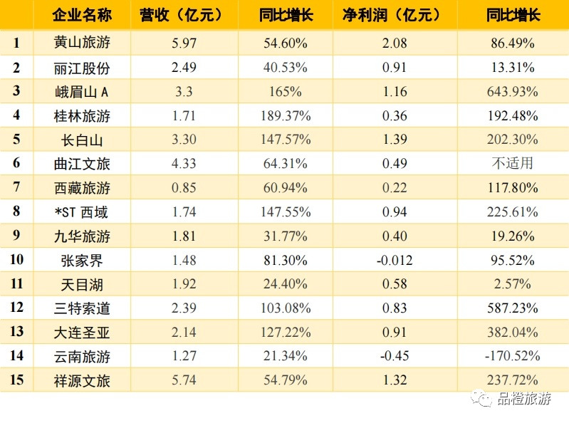 在本次统计的 15 家景区类上市企业中,营收同比增长超过 100%的有 5 家,其中,桂林旅游 (000978) 的增速达到 189.37%: 净利润同比增长超过 200%的有 6家,其中,峨眉山 A (000888) 的增速达到 643.93%。