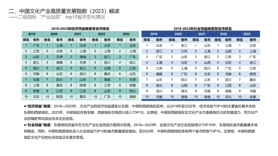 “经济效益”维度:2019-2023年,文化产业的经济效益逐渐从东部、中部和西部地区延伸。从2019年至2022年,经济效益TOP10的主要省份基本来自东部和西部地区。2023年,中部地区仅有安徽,西部地区仅有四川进入TOP10。这表明,中部和西部地区在文化产业方面具有巨大的发展潜力,而文化产业的辐射带动效应尚未完全显现。