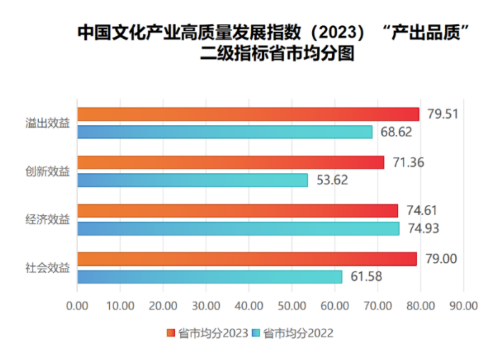 “产出品质”方面,全国相关省市文化产业除了“经济效益”外,“溢出效益”“创新效益”“社会效益”均提升明显。