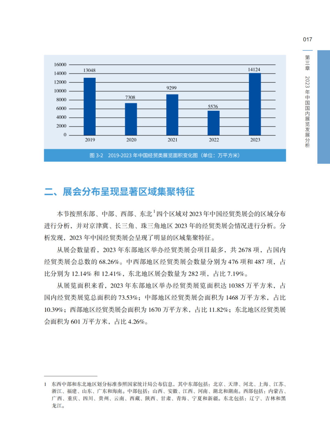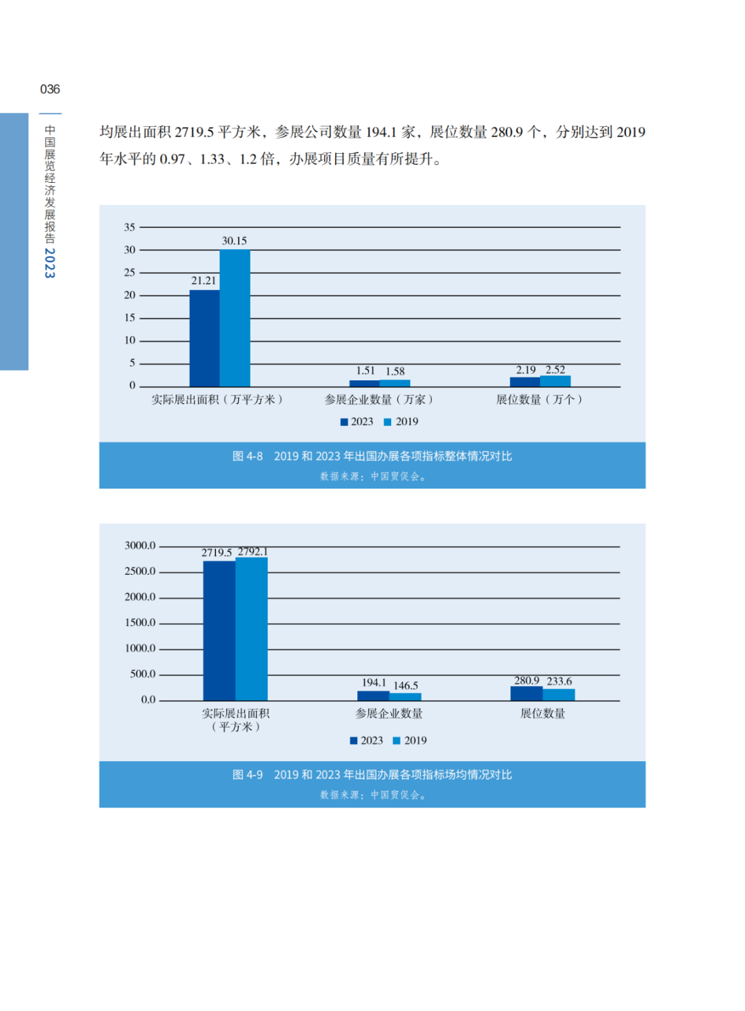 2023年中国共举办经贸类展会3923场,较2022年增长117.1%,较2019年增长10.6%;办展总面积1.41亿平方米,较2022年增长153.3%,较2019年增长8.25%。