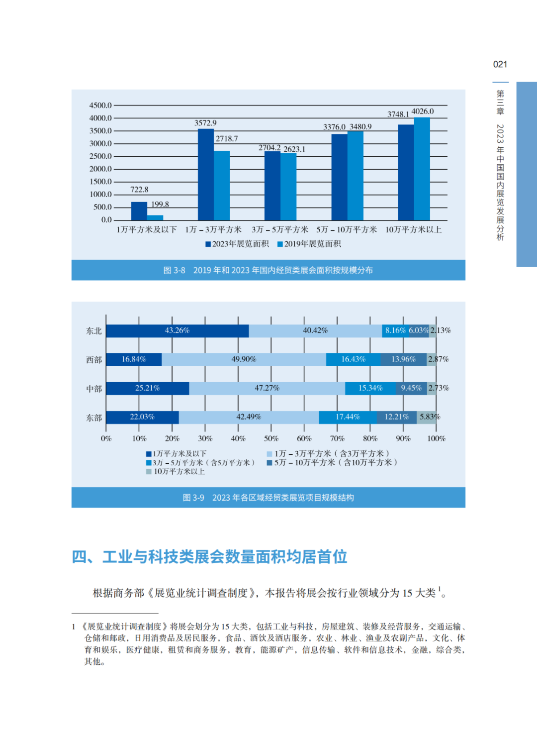 从区域分布来看,展会分布呈现明显的区域集聚特征,中国东部地区举办经贸类展览项目数量和面积均领跑全国,全国占比分别为68.26%和73.53%;京津冀、长三角、珠三角仍是热门展览区域,2023年三大区域举办经贸类展会数量占全国比重为57.35%,总展览面积占全国比重达63.27%。从行业分布来看,工业与科技类展会在数量和面积上均居各行业展览首位。
