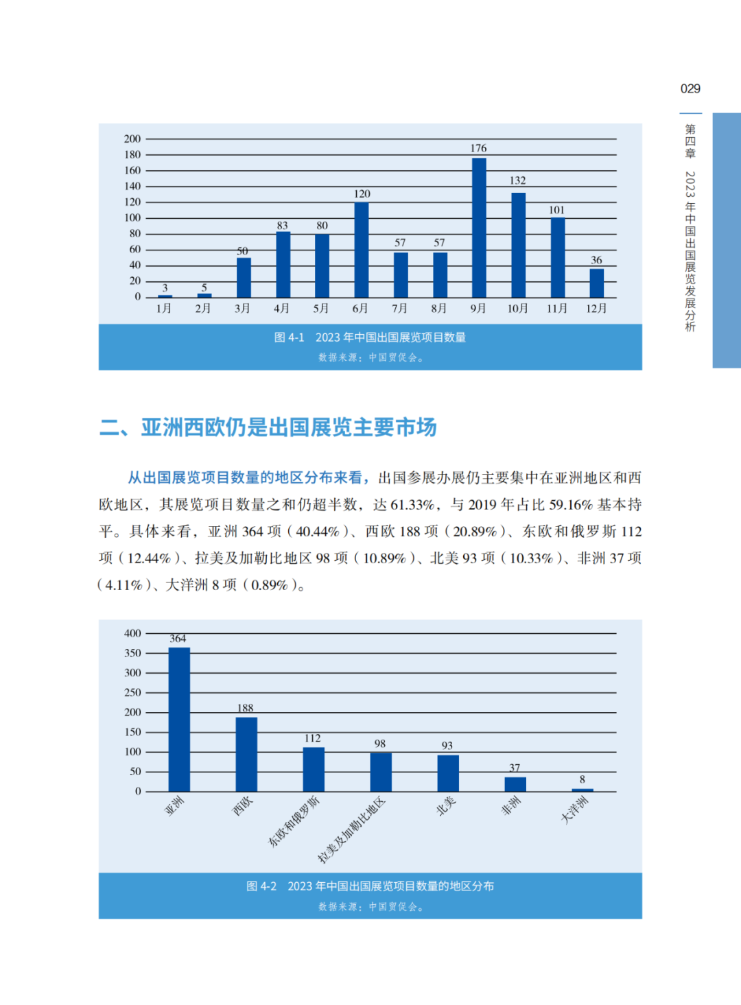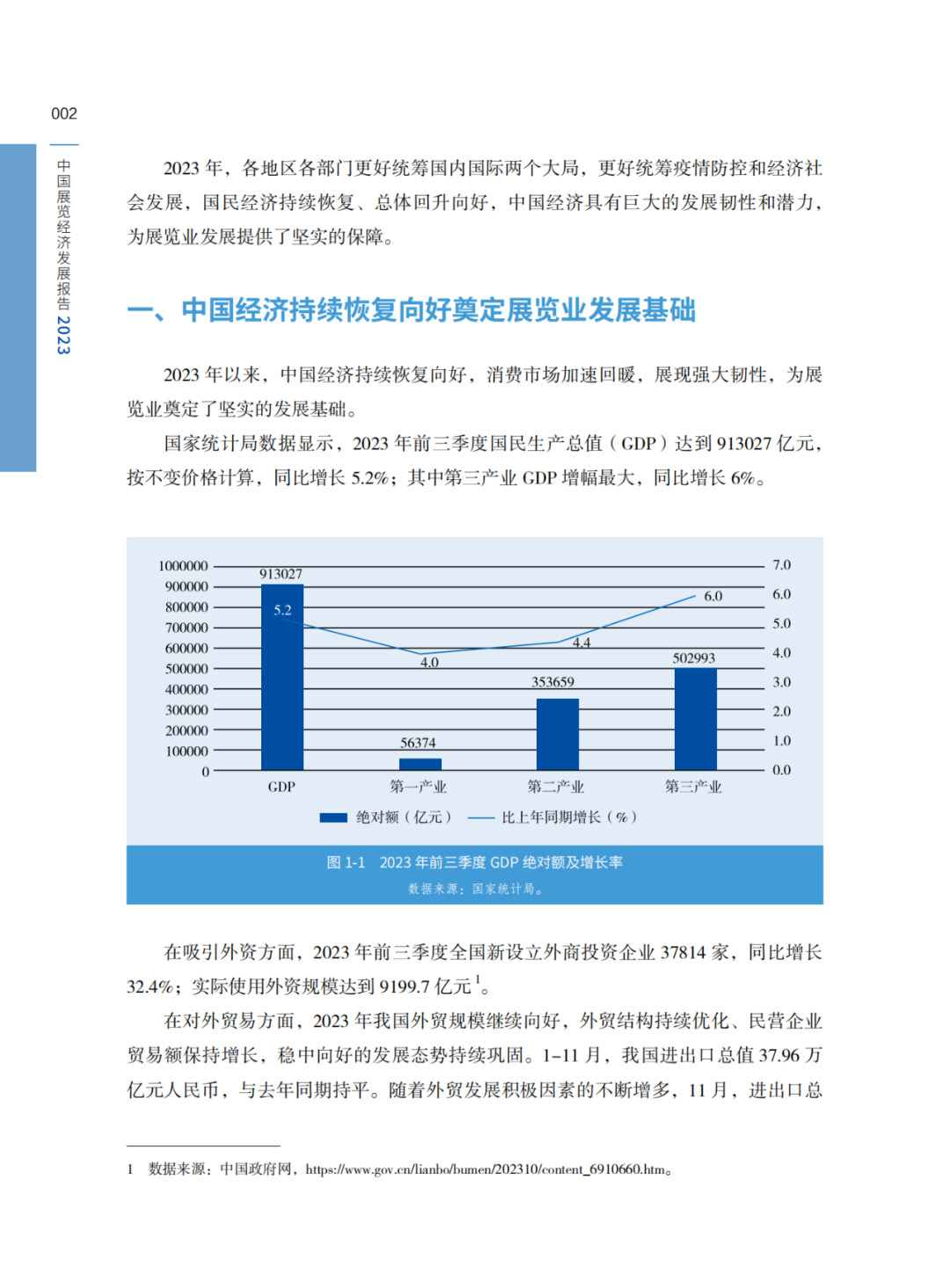 中国贸促会展览管理部部长邬胜荣介绍,2023年,中国展览业发展呈现五大特征:中国经贸类展会全面恢复至疫情前水平;展览业经营主体经营情况不断恢复向好;企业重启出国参办展,加大市场开拓力度;国家级展会成为引领展览业复苏排头兵;展览馆实际运营数量和利用率大幅提升。