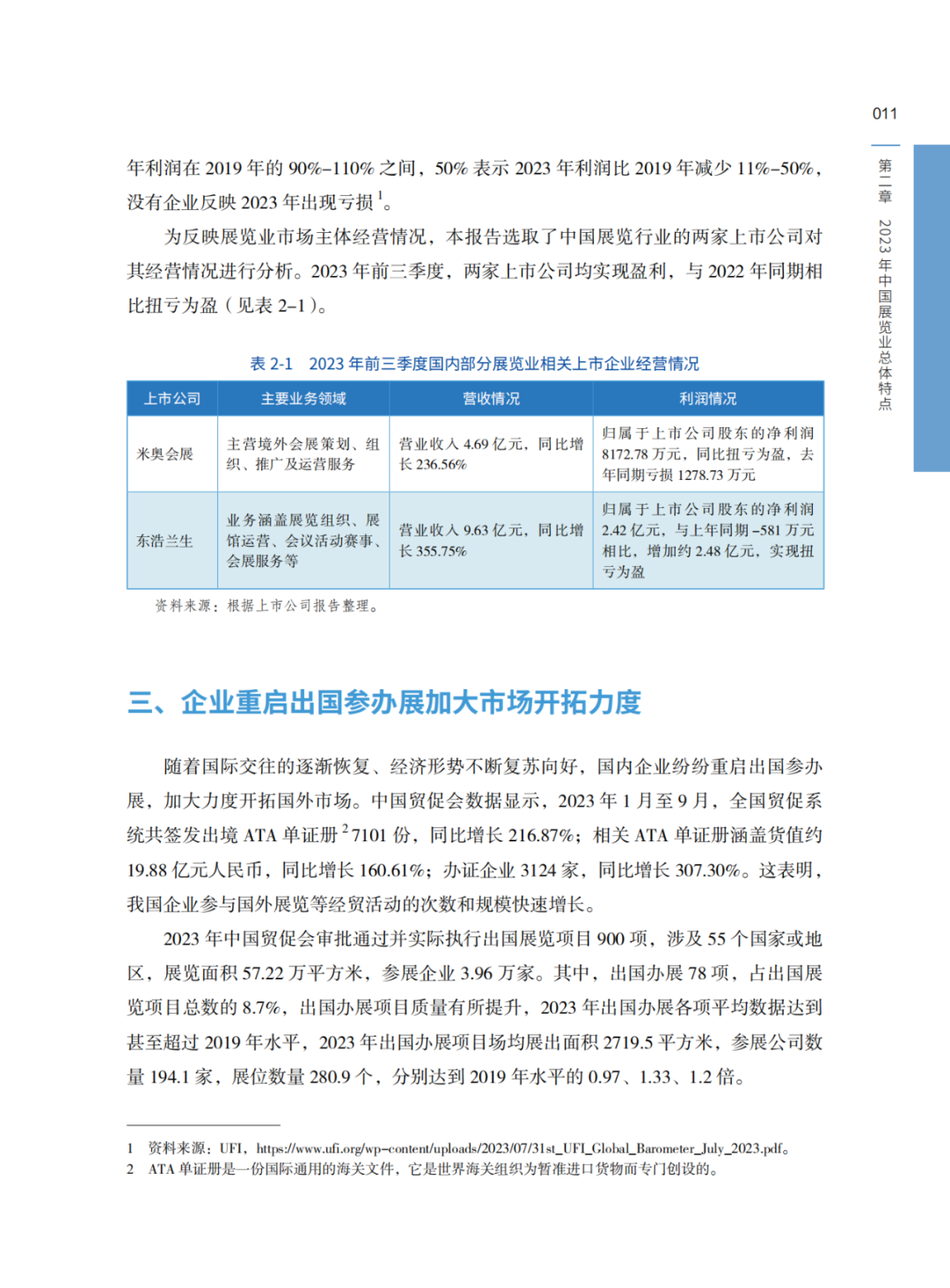 随着线下展览市场需求的回暖、展览业的逐渐恢复,展览业相关市场主体的经营情况不断向好。相关数据显示,中国展览企业2023年营业收入与利润不断恢复,中国多个展览业上市公司实现扭亏为盈或利润大幅增长。