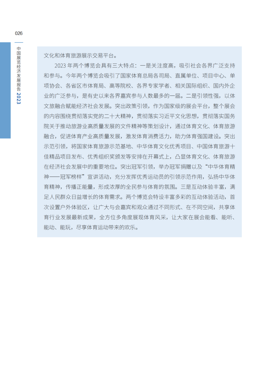报告显示,国家级展会成为引领展览业复苏排头兵。2023年,各国家级展会全面恢复线下展,进博会、广交会、消博会等展会在规模、成效等方面全面超越疫情前水平。