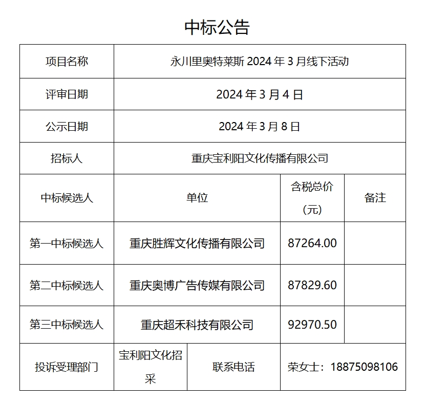 永川里奥特莱斯2024年3月线下活动中标公告