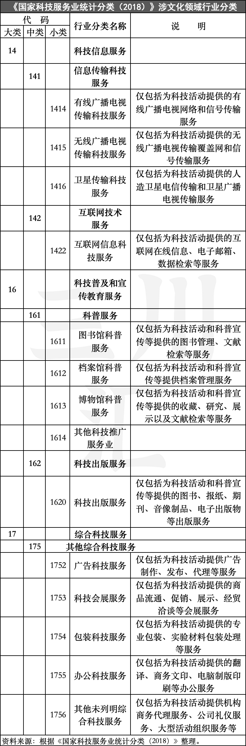 该分类主要以应用高技术手段为社会提供服务活动为参照,共包括信息服务、电子商务服务、检验检测服务、专业技术服务业的高技术服务、研发与设计服务、科技成果转化服务、知识产权及相关法律服务、环境监测及治理服务和其他高技术服务等9大类,以及25个中类97个小类。其中,涉及文化、广电和传媒领域涵盖1个大类2个中类14个小类(并非全部)。
