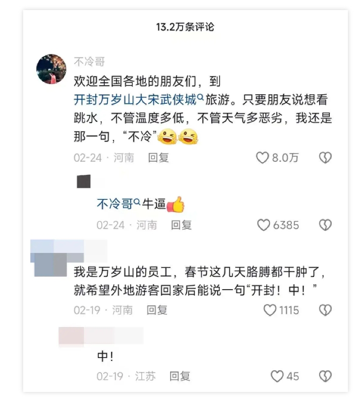 这条视频最终抖音获赞超151万,也让便宜、真诚、好玩的万岁山武侠城得到了大批网友关注。不少网友留言:“真的吗?门票80元全是大戏,景区吃的很便宜,真的吗?”
