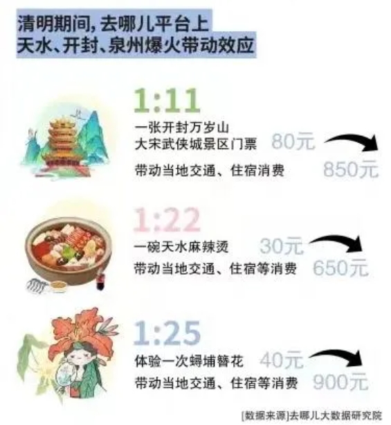 这些数据充分说明了旅游活动对低线城市的巨大贡献。据去哪儿大数据研究院的估算:一顿30元的天水麻辣烫不仅限于餐饮本身,还能带动当地交通、住宿等消费额增加至650元;前往开封万岁山武侠城景区的门票80元,可促进当地交通、住宿消费达850元;而泉州簪花体验活动只需40元,却能带动当地交通、住宿消费高达900元。